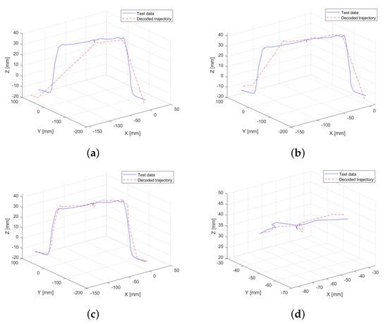 Finally, to evaluate the robustness of the model, a final experiment is conducted in which the model is trained using the complete dataset, while the sequence of observable variables is generated digitally. This sequence is constructed based on the average length of the training observable variable sequences and the number of groups into which they are discretized. The results of this experiment are shown in Figure 7, where the learned trajectory closely resembles the test trajectory used for visual comparison. This experiment shows a significant error reduction of 52.27% compared to the trajectories generated with the model trained exclusively on motion data and using observable variables obtained from a real trajectory. Such a result is highly acceptable, considering that the trajectory does not account for the distribution of key points, as they have been uniformly defined. These findings highlight the robustness of the model when handling observable sequences that differ from those used during training.