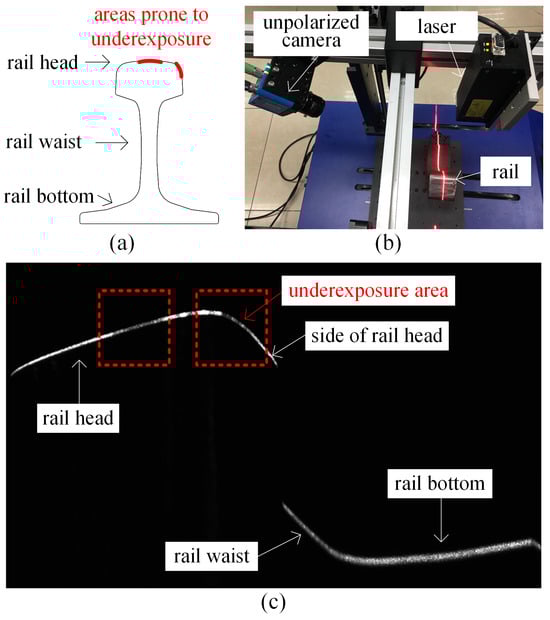 Local underexposure of the rail laser section image. (a) Rail areas prone to underexposure; (b) image acquisition device; (c) local underexposure image.