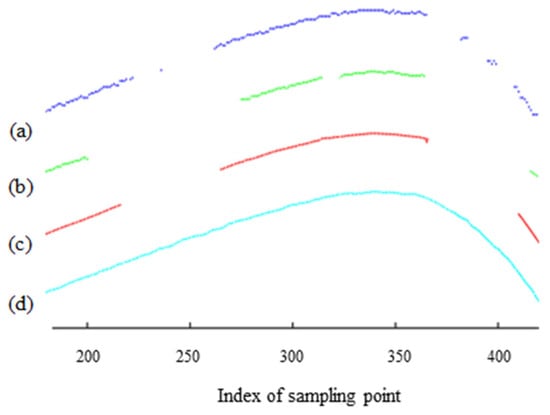 The center-of-light stripe in the underexposed area of the rail laser section image. (a) The maximum value algorithm; (b) the center-of-gravity algorithm; (c) the Steger algorithm; (d) the Miniprof profilometer.
