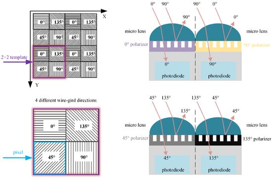A polarized camera is equipped with four polarization filters in different directions, which can simultaneously capture the polarization component images of the rail laser section from four directions. These images are abbreviated as four-directional polarization component images. Figure 4 shows the polarization filters and pixel distribution of the polarized camera. The four polarization filters of the polarized camera are arranged in a 2 × 2 configuration. Sub-pixels in the 2 × 2 template correspond to nanowire grating polarization filters at 0 degrees, 135 degrees, 45 degrees, and 90 degrees, respectively. The polarized light whose vibration direction is perpendicular to the nanowire grating will pass through the filter, while the polarized light whose vibration direction is parallel to the nanowire grating will be filtered out. All sub-pixels of the 2 × 2 template in the same polarization direction constitute a polarization component image. The gray values of all the sub-pixels at the same position in the 2 × 2 template are extracted to obtain four polarization component images that are 1/2 of original images in width and height. The four images are marked as ,, and respectively. According to the Stokes representation method of polarized light, total intensity image is expressed below: