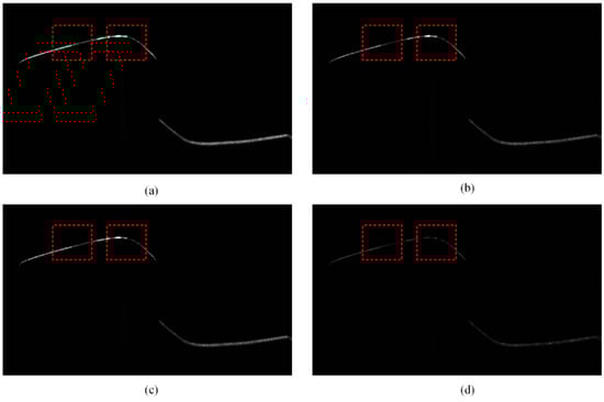 The same position of the rail shown in Figure 2 was photographed with a polarized camera, to obtain four polarization component images of the rail laser section, as shown in Figure 5, the red box represents the same position as the red box in Figure 2. Then, the Stokes parameter images , and , linear polarization degree image IDoLP, and linear polarization angle image IAoP were obtained based on the results of calculation according to the Equations (6), (7) and (8) respectively, as shown in Figure 6 and Figure 7. The red box represents the same position as the red box in Figure 2.