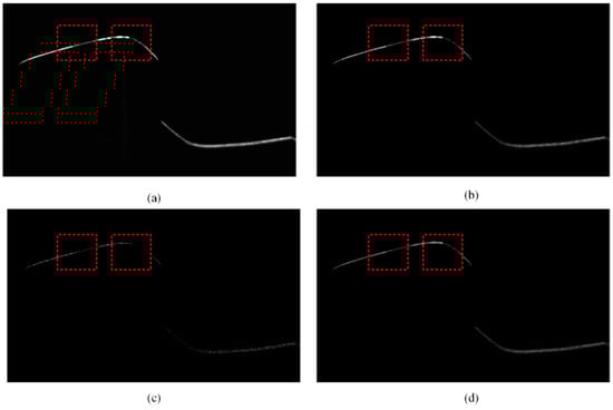 Figure 2 shows the intensity image of the rail laser section captured by the traditional profile measurement method based on an unpolarized camera. The light stripe area of the rail head and the area near the rail gauge point are prone to low contrast and underexposure. This is because of the smooth surfaces and curvature changes in these areas, which result in a lack of diffuse reflection components in the camera. These factors lead to insufficient light reflection, making it difficult for the camera to capture clear images. This issue is highlighted in the dotted rectangular box in Figure 2c. Figure 3 shows the results of light stripe center extraction from the area in the dotted rectangular box in Figure 2. Here, (a), (b), and (c) represent the maximum value algorithm [28], the center-of-gravity algorithm [29], and the Steger algorithm [30] respectively, while (d) indicates the result of mapping the measurement data of the Miniprof profilometer to the image coordinate system. The Miniprof profilometer can achieve high-accuracy measurement because it directly contacts the test object. Its measurement results can be used to compare the effects of different light stripe center extraction algorithms. The comparison results show that in the normal intensity image area of the rail laser section, the rail profiles obtained by different light stripe center extraction algorithms are basically the same as those obtained by the Miniprof profilometer. In the underexposed area of the image, due to weak light stripe energy and low contrast, the light stripe center obtained by any light stripe center extraction algorithm is interrupted to varying degrees. The interrupted light stripe center cannot reflect the actual profile of the rail, resulting in the loss of rail profile data and affecting the rail profile registration. Severe underexposure will lead to the loss of data near the rail gauge point. Since the rail gauge point is a characteristic point for rail wear measurement, rail wear measurement may fail when this characteristic point is missing. The imaging quality and accuracy of traditional rail profile measurement based on intensity information need to be improved. Prolonging the exposure time can alleviate local underexposure. However, it causes overexposure of light stripes in the normal area. This undermines the accuracy of light stripe center positioning in the normal area. Therefore, the problem of local underexposure of rail laser section images cannot be effectively solved only by adjusting the exposure time.