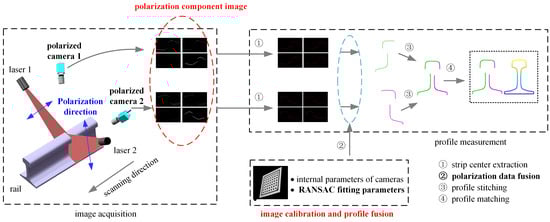 Based on the above analysis results, this paper proposes a rail profile measurement method based on polarization imaging, as shown in Figure 8. Specifically, the laser is equipped with a linear polarizer to obtain the linearly polarized light in the laser plane in the vibration direction, and the polarization direction of the laser is shown in the figure. In addition, a polarized camera is used to capture the polarization component images of the rail laser section from multiple polarization angles. Stokes parameter images , and , linear polarization degree image IDoLP, and linear polarization angle image IAoP are synthesized from such polarization component images. The aforesaid images are fused through the image fusion algorithm to obtain rail laser section images, which lays a foundation for light stripe center extraction, calibration, profile stitching, profile registration, and final rail profile measurement.
