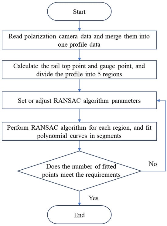 To solve the above problems, based on previous research results, this paper proposes an improved rail profile measurement method based on polarization imaging. Specifically, a polarized camera is first used to capture the polarization component images of the rail laser section from multiple angles. Then, the polarization information of the rail laser section is extracted, and the Stokes parameter images, linear polarization angle images, and linear polarization degree images are calculated. Based on the S-RANSAC algorithm, the rail profile data corresponding to multiple polarization component images are fused. The fused data are used as the final rail profile measurement result. This method effectively improves the accuracy of rail profile measurement results under complex working conditions.