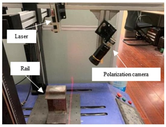 The rail profile measurement device was constructed, as shown in Figure 10. The rail shown in Figure 2 was placed on the electronic control translation platform. The Genie Nano M2450 polarized camera manufactured by Teledyne Dalsa, a Canadian company headquartered in Waterloo, Ontario, was selected to photograph the same position of the rail in Figure 2. The laser cross-sectional images of the rail were acquired at equal intervals of 2 mm. The main parameters are shown in Table 1.