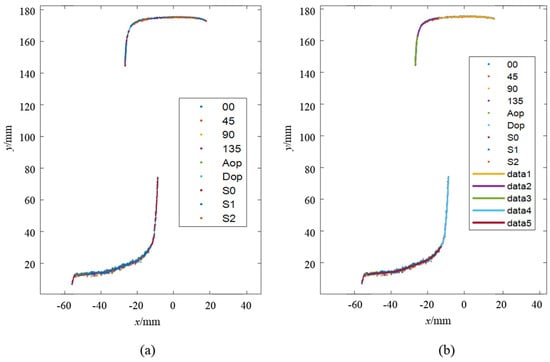 This process enabled the acquisition of the four-directional polarization component images of the rail laser section. Then, Stokes parameter images , and , linear polarization degree image IDoLP, and linear polarization angle image IAoP are calculated and obtained respectively according to the Equations (6), (7) and (8), as shown in Figure 6 and Figure 7. We extracted the light stripe center using the gray centroid method [29]. The proposed S-RANSAC algorithm was then employed to fuse each polarization component, and the outcomes are illustrated in Figure 11. Data 1 to data 5 represent the partition fitting results, which are respectively the rail top region, rail head transition region, rail head side region, rail web region, and rail bottom region. By comparing with Figure 3, it becomes evident that the traditional method incurs data loss in the rail head area. In contrast, the proposed method is capable of obtaining effective contour data in the rail head area.