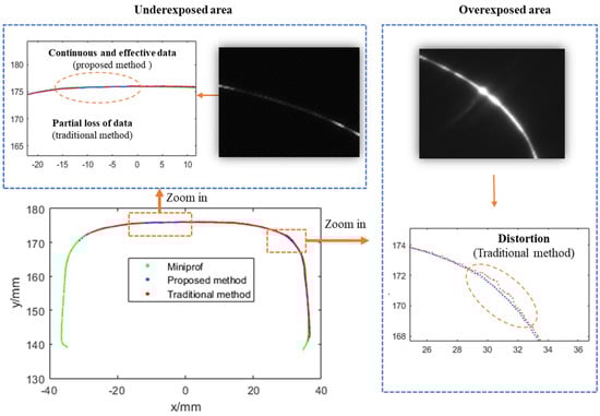 The on-site dynamic test was carried out near Qinghecheng Station at K 346 on the Beijing–Kowloon Line. The Beijing–Kowloon Line is a trunk railway with shared passenger and freight traffic. Due to its high traffic volume and diverse cargo types, the on-site operational conditions are relatively complex: the rail surface is often relatively shiny and mixed with foreign objects, which affects image quality. The profiles of the tested railway line include situations such as web burial of the rail, ambient light interference, and the polished rails. Miniprof, a contact-type rail profile measurement device with a measurement accuracy of 0.02 mm, was used as a reference. The rail profile obtained from the Stokes parameter image was considered as the measurement result of the traditional method. Given the difference in the number of points collected by the measurement system and the number of points obtained by Miniprof, it was necessary to perform smoothing processing before discretizing the profile. This ensured that corresponding point pairs could be compared, thereby enabling a genuine evaluation of the profile difference. Figure 13 shows a comparison diagram of the rail profile at one typical position. The figure contains two enlarged areas, namely the underexposed area at the top of the rail (in the upper left corner of the figure) and the overexposed area on the side of the rail head (on the right side of the figure). In the underexposed area, partial data loss occurred (the red dots are interrupted) when using the traditional method. However, since the proposed method acquires more polarization information through the polarization imaging technology and adopts a fusion method based on divided regions, continuous and valid contour data can still be obtained in this area, and there is a high degree of consistency with the contour data obtained by Miniprof. Similarly, in the overexposed area, data distortion and deformation occurred (the red dots deviate significantly from the green dots) with the traditional method. Nevertheless, the contour data obtained by the proposed method still show a high degree of consistency with that obtained by Miniprof. Thus, it can be demonstrated that the proposed method can simultaneously address the issues of both underexposure and overexposure.