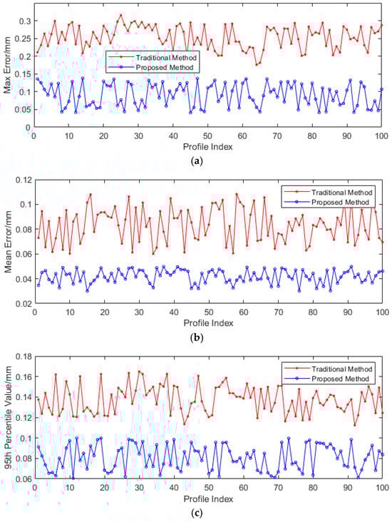 To quantitatively compare the accuracy of the rail profile measurement of the proposed method, 100 sets of rail profile data were collected using Miniprof. For each sampling point, the Miniprof measurement data were taken as the true value, and the differences between the rail profile data obtained by the traditional method and the proposed method and the Miniprof data were statistically analyzed. The statistical parameters included the maximum error (ME), average error (AE), and 95th percentile error (PE). The results are presented in Figure 14, and Table 2 shows the average values of the three statistical measures mentioned above. Compared with the traditional method, the maximum, average, and 95th percentile values of the rail profile measurement errors have all decreased to varying degrees. Taking the 95th percentile value of the rail profile measurement error as an example, it has significantly declined from 0.137 mm, as recorded in conventional methodologies, to 0.081 mm. This represents a remarkable reduction of 40.9%. This clearly demonstrates the enhanced precision of the rail profile data obtained through the proposed method, which now more accurately represents the true profile of the rail.
