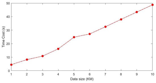 To verify the execution efficiency of the S-RANSAC algorithm, typical profile data were selected for testing. The computer CPU parameters were Intel(R) Core(TM) i7-10700K CPU @ 3.80 GHz, and the programming language used was C++ (version 20). To improve the efficiency of algorithm execution, a programming architecture for data concurrency was designed. The 4000 sets of profile data collected per kilometer were divided into 10 concurrent queues, with each queue buffering 400 sets of profile data. The relationship between algorithm execution efficiency and data size is shown in Figure 15. Due to the randomness of RANSAC, the time consumption may vary slightly each time, but it can process approximately 200 m of data per second.