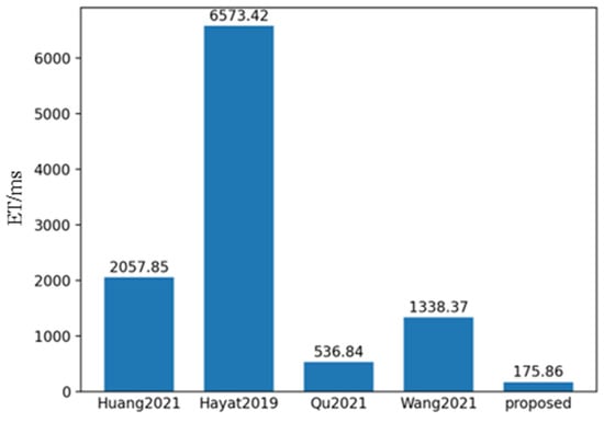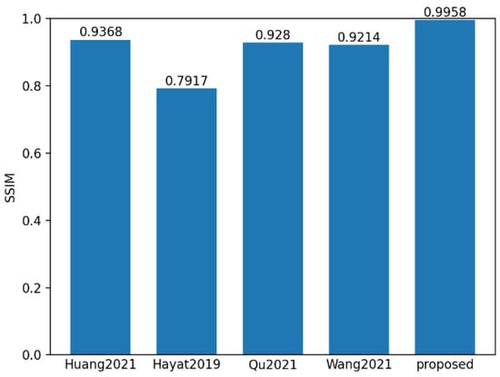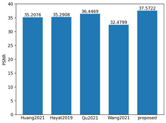 To evaluate the performance of the proposed method, 550 sets of polarization component images of steel rails were randomly selected, and the proposed method, along with the methods in references Huang [31], Hayat [32], Qu [33], and Wang [34], were used for fusion analysis. SSIM and PSNR are the most commonly used indicators for evaluating multi-exposure fusion algorithms in dynamic scenes. The PSNR indicator measures the similarity between the fused image and the source images in terms of image gray levels. A larger PSNR means that the fused image is close to the source images and has less distortion. Therefore, the larger the PSNR value, the better the fusion performance. SSIM is used to model image losses and distortions, to which the human visual system is sensitive. It consists of three parts, namely correlation, luminance, and contrast distortion. The SSIM between the source image and the fused image is defined as the product of these three parts. SSIM reflects the degree to which the fused image preserves the local structural details of the input images. The larger the value of this indicator, the greater the degree of structural preservation, and the better the fusion effect. ET represents the algorithm execution time. As shown in Figure 16, Figure 17 and Figure 18, it can be observed that the proposed method achieved the highest scores in both PSNR and SSIM, which were 37.57 and 0.99 respectively. Compared with the PSNR of 36.44 and the SSIM of 0.928 of the method proposed by Qu, who ranked second, and the execution time of 536.84 ms, the proposed method is not only better in maintaining data quality and structural integrity, but also more efficient in algorithm execution, with the time being only 175.86 ms, reflecting its efficient processing ability and good fusion effect.