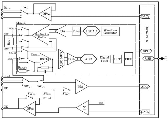 The main component of the PIA is the AD5940 (Analog Devices Inc., Norwood, MA, USA), an integrated circuit for performing various electrochemical measurement methods such as EIS. The AD5940 includes two analog front end (AFE) loops with excitation modules, potentiostats, transimpedance amplifiers (TIAs), a programmable gain amplifier (PGA) and a 16-bit analog-to-digital converter (ADC) designed for different frequency ranges with corresponding power consumption. A low-bandwidth AFE loop covers a range from direct current (DC) to 200 Hz, whereas a high-bandwidth AFE loop covers higher frequencies up to 200 kHz. For the sake of clarity, Figure 1 shows only the high-frequency loop, which includes a high speed transimpedance amplifier (HSTIA) and a high speed digital-to-analog converter (HSDAC). The sensor to be measured is connected to the internal AFE loops via a programmable switching matrix. Both the gain and the load resistance of both transimpedance amplifiers are programmable. External amplification and calibration resistors () can also be connected to the chip through the matrix. Using external calibration resistors , the AD5940 performs a ratiometric measurement. The digitized signals are evaluated by means of the discrete fourier transform (DFT). The real and imaginary parts of the impedance can then be read out with a first-in-first-out (FIFO) buffer.