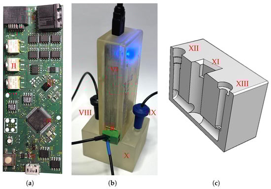 (a) PCB of the PIA, (b) the measurement setup for the application with ISFETs without opaque box and (c) the 3D cross-sectional model of measuring chamber. I: Connectors for ISFETs, RE and CE; II: Switches for changing between two-electrode (CE, WE) or three-electrode setup (CE, RE, WE); III: AD5940; IV: microcontroller (STM32L4): V: USB port for power and communication with a PC; VI: PIA with casing; VII: Connection for the external RE and CE VIII: CE; IX: RE; X: Measuring chamber filled with pH solution; XI: Opening for the ISFET chip; XII: Opening for RE; XIII: Opening for CE.