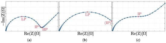 For the development of the circular fitting, the simulated data was divided into three categories based on the occurrence of HPs, LPs and IPs. Thus, these categories describe different manifestations of the Randles circuit in the Nyquist diagram, as shown in Figure 4. Category I shows a HP, LP and IP, respectively. In contrast, category II has only a LP and optionally a IP. Category III exclusively includes an IP.