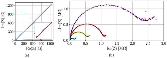 Figure 11 shows the Nyquist plots of two ISFETs placed simultaneously in three different pH solutions. The data were analyzed with the circular fitting, CNLS with PreFit [23] and the elliptical fitting [24,25]. Assuming that CNLS is the reference method in this case, the circular fitting achieved an average error of in the determination of . In comparison, the elliptical fitting achieved an error of .