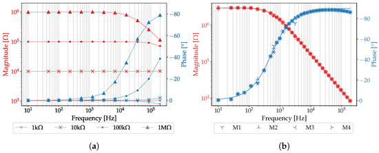 Frequency response (red: magnitude; blue: phase) of the portable impedance analyzer. (a) Frequency responses considering resistors to be measured between 1 kΩ and 1 MΩ. (b) Frequency responses of a 3 MΩ resistor in parallel connection with a capacitor with four repetitions (M1–M4). The solid line shows the theoretical frequency response.
