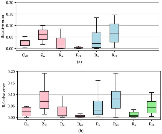 Figure 9 clearly shows that the results of the PIA (errors for : CNLS 0.4%, elliptical fitting 8.0%) are marginally worse than those of the VSP-300 (CNLS 0.1%, elliptical fitting 6.7%). For , the medians are of similar order of magnitude, but the interquartile range of the relative errors is larger using the PIA. With a median error of 4.2% for , the circular fitting shows clearly reduced errors compared to the elliptical fitting. This phenomenon can be attributed to the fact that the appearance of the Randles circuit in the Nyquist plot is described by a (half) circle. Furthermore, the CPE leads to a rotation of the circle with the zero point as the fixed point, rather than an apparent compression of the circle. However, the semicircle can be distorted on the low-frequency side due to the influence of the Warburg impedance, which can lead to errors due to the larger number of degrees of freedom of ellipses. Nevertheless, the circular fitting does not achieve the same level of accuracy as the CNLS.