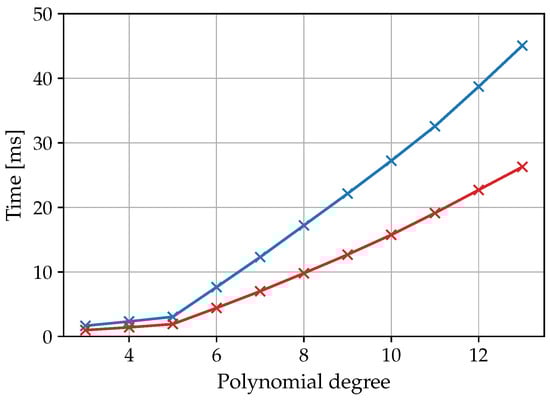 Influence of the polynomial degree and the number of spectral data points (blue: 50 data points, red: 25 data points) on the calculation time of the entire fitting algorithm. The recorded times are the mean values from 100 spectra of the test data set.