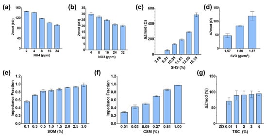 Calibrated dose–response for the 6 sensors used in this study in loamy–clay soil for (a) ammonium, (b) nitrate, (c) soil hydration state, (d) soil volumetric density, (e) soil organic matter, (f) carbonaceous soil minerals, and (g) total soil carbon using N = 3 different sensors per parameter. The plots are drawn using the mean ± standard error.