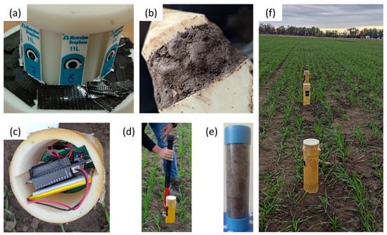 (a) A photograph of the sensors after waterproofing the connectors. (b) Padding of the sensors with the dug-up soil before insertion ensures contact between the sensors and the surrounding soil. (c) The portable data logger and potentiostat are housed at the top of the probe for ease of access to replace batteries on a weekly basis. (d) The sampling method used to collect the (e) soil cores for analysis at a standard soil-testing laboratory. (f) The three Sensor-in-Field probes placed 2 to 4 m apart in a winter wheat plot in St. Louis, MO, USA.