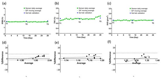 (a–c) Time series data plotted using the daily mean of 9 measurements: 3 measurements a day across 3 probes. Alongside them are the 6 data points obtained from the analysis of the soil cores by a standard soil testing laboratory. T1, T2, and T3 denote the days when soil cores were sampled and shipped to the soil testing laboratory. The soil health metrics presented are (a) soil organic matter, (b) total soil carbon, and (c) soil volumetric density. (d–f) Show the Bland–Altman analysis of the lab and sensor data on sampling day, presented as percentage difference on the y-axis and the average on the x-axis. All three parameters have an average difference of less than 4% between the two methods.
