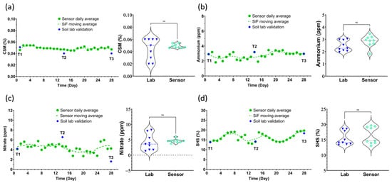 Time series data plotted using the daily mean of 9 measurements: 3 measurements a day across 3 probes. Alongside them are the 6 data points obtained from the analysis of the soil cores by a standard soil testing laboratory. T1, T2, and T3 denote the days when soil cores were sampled and shipped to the soil testing laboratory. The soil health metrics presented are (a) carbonaceous soil minerals, (b) nitrate, (c) ammonium, and (d) soil hydration state. The sensor data on sampling day was used to plot violin graphs. t-test analysis shows a non-significant difference between the sensors and lab data (ns: p-value > 0.005).