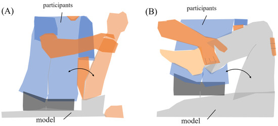 Range of motion for experimental tasks. (A) Upper limb raising exercise. The subject moved the model’s arm from elbow extension to 90° shoulder flexion, then returned it to the original position. (B) Lower limb flexion exercise. The subject moved the model’s lower limb from extension to 90° knee flexion, then returned it to the original position.
