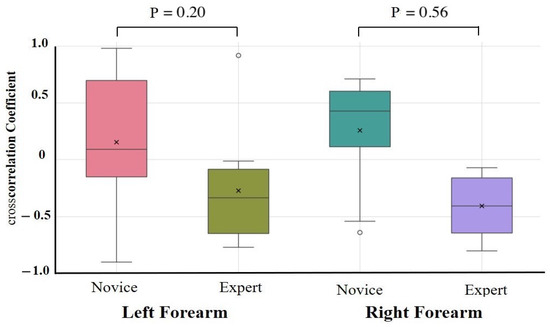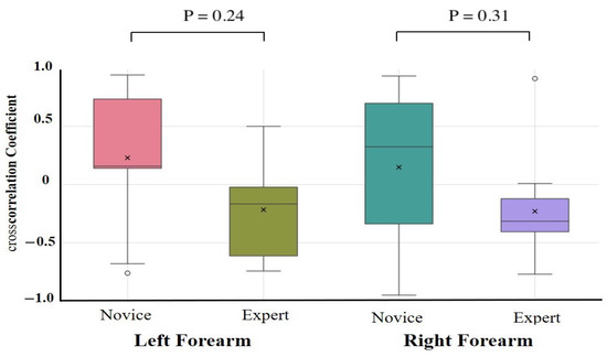 Cross-correlation analysis during upper limb raising exercise. Cross-correlation analysis was performed on forearm flexors and extensors. Although not statistically significant, a moderate-to-large effect size was observed in the forearm during the upper limb raising task, with experts showing more negative cross-correlations than novices.