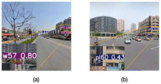 When multiple small traffic signs are closely positioned, the output detection head of conventional detectors lacks perception resolution to effectively distinguish adjacent signs, leading to a relatively severe issue of missed detections in traditional object detection methods, as shown in Figure 1a. Additionally, in road environments, complex backgrounds remain a significant challenge for object detection. Urban environments often contain a large number of visually similar interfering elements, such as billboards and store signs. These elements exhibit strong similarities with traffic signs in terms of shape and color, thereby increasing the risk of missed detections and false positives [9], as illustrated in Figure 1b.