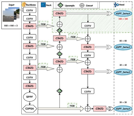 To address this, we propose the Traffic Sign Detection Network (TSD-Net), an improved detection framework with the following targeted improvements. To enhance the model’s expressiveness, we innovatively combine the C3k2 module with dynamic convolution [25], which adaptively generates convolution kernel weights to increase flexibility in feature extraction while reducing FLOPS. To handle the complex urban environments, we incorporate a feature enhancement module [26] to strengthen the model’s ability to capture target details while suppressing background interference. To address the insufficient resolution problem in small traffic sign detection, we enhance the feature pyramid architecture with a refined high-resolution detection branch and introduce an adaptive spatial feature fusion [27] detection head with dynamic convolution [25] for optimal cross-scale feature fusion, which effectively preserves fine-grained features of small objects. Through these improvements, our method effectively enhances the detection performance for traffic signs, especially in challenging scenarios with small objects and complex backgrounds.