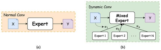 There are significant structural differences between conventional convolution and dynamic convolution. Conventional convolution processes input features X using only a single fixed kernel, while dynamic convolution fuses parameters from multiple expert kernels to create a richer parameter space. For input features X, our dynamic convolution layer with M experts () is defined as [25]: