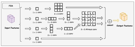The overall architecture of FEM is illustrated in Figure 6. This module comprises two branches equipped with atrous convolution. Each branch initially performs a 1 × 1 convolution operation on the input feature map to optimize channel dimensions for subsequent processing. The first branch is constructed as a residual structure, forming an equivalent mapping feature map to preserve critical feature information of small objects. The remaining three branches perform cascaded standard convolution operations with kernel sizes of 1 × 3, 3 × 1, and 3 × 3, respectively. Notably, the middle two branches introduce atrous convolution, enabling the extracted feature maps to retain richer contextual information. Finally, the outputs from all branches are concatenated along the channel dimension, generating a comprehensive feature representation containing multi-scale and multi-directional information.