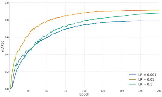 To determine the optimal hyperparameter configuration, we implemented a systematic parameter sensitivity analysis. As illustrated in Figure 8, we conducted a detailed evaluation of learning rates, testing three distinct values ranging from 0.001 to 0.1. Experimental results demonstrated that a learning rate of 0.01 yielded the optimal mean Average Precision (mAP) performance on the validation set. We configured the batch size to 32, which efficiently utilized the GPU memory resources (24 GB), achieving an actual memory consumption of 20.27 GB during operation. We established the optimal training duration at 200 epochs. As shown in Table 2, the model performance stabilized after approximately 200 epochs, with mAP50 reaching 0.9137. Extending the training beyond this point showed minimal improvements, with performance fluctuating within 0.07% through 300 epochs, indicating that 200 epochs is sufficient for model convergence.