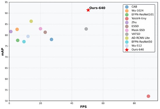 We evaluate our method using standard object detection metrics. Mean Average Precision (mAP) at an IoU threshold of 0.5 is used as the primary evaluation metric, representing the average AP across all classes. For efficiency assessment, we report Floating Point Operations (FLOPs) to measure computational complexity and Frames Per Second (FPS) to evaluate the real-time processing capability of the model. For real-time systems such as autonomous driving, a processing speed of at least 30 FPS is required to ensure that the model can analyze input data and respond in a timely manner [14].