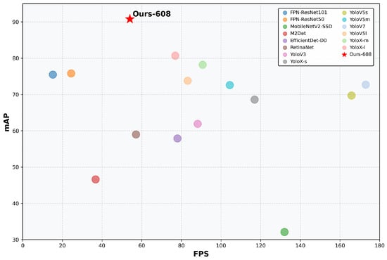 - Wang, C.Y.; Bochkovskiy, A.; Liao, H.Y.M. YOLOv7: Trainable bag-of-freebies sets new state-of-the-art for real-time object detectors. In Proceedings of the IEEE/CVF Conference on Computer Vision and Pattern Recognition, Vancouver, BC, Canada, 17–24 June 2023; pp. 7464–7475. [Google Scholar]