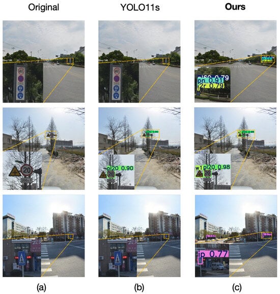 Traffic sign detection results on TT100K. (a) Original image; (b) Detection results using YOLO11s; (c) Detection results using our proposed method.