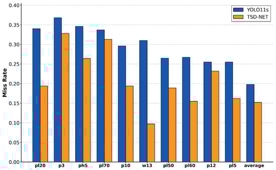 Given the numerous traffic sign categories in TT100K, we selected the ten traffic sign classes with the highest miss rates in YOLO11s for comparison with our model, as shown in Figure 12. We can clearly observe that TSD-Net consistently exhibits lower miss rates across various traffic sign categories compared to the YOLO11s model. Particularly noteworthy is the performance on w13 class signs, where TSD-Net achieves a miss rate of only approximately 0.10, representing a reduction of about 67% compared to YOLO11s’s 0.31. For pl60 and pl5 class signs, TSD-Net also maintains miss rates below 0.16 and 0.16, respectively, showing significant improvement over YOLO11s’s 0.26 and 0.25.