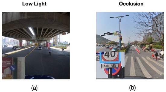 Low-light Conditions. As shown in Figure 13a, under low-light conditions, the overall image brightness is significantly reduced, resulting in blurred color and texture features of traffic signs with diminished contrast, which impedes the model’s ability to accurately recognize them.