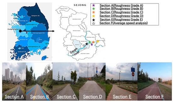 The study sections were chosen based on high bicycle usage and previously documented issues concerning pavement deterioration and maintenance. A preliminary field survey was conducted across the entire bicycle network in Sejong City, along the Geum River, utilizing both walking and cycling to evaluate pavement conditions, materials, and the occurrence of cracks and surface irregularities. The descriptions of the survey sections are depicted in Figure 1. To ensure the comprehensive inclusion of varying service levels described in Table 1, the selected sections represented a spectrum of pavement conditions, ranging from well maintained (A) to those in need of substantial repairs (E). The primary goal of this selection was to obtain reliable reference data to validate the sensor-based pavement roughness measurements. The selection criteria were based on pavement roughness standards outlined in Korea’s Guidelines for the Installation and Management of Bicycle Facilities [12]. Additionally, information on pavement material types, surrounding environments, and usage levels was gathered to facilitate a comparative analysis of spatial patterns in pavement deterioration and hazard distribution. Based on these surveys, five final study sections (A–E) were chosen. For each section, detailed investigations were conducted, including bicycle usage surveys, pavement roughness measurements, and the identification of hazardous elements [8,12].