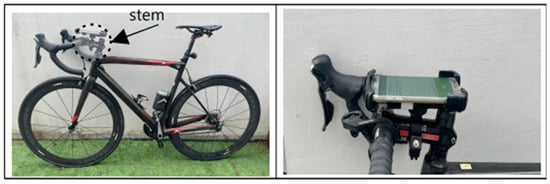 The smartphone mounting position was determined based on related research suggesting that this positioning minimizes the impact of road surface irregularities and vibrations on sensor measurements [17]. In this study, a mounting system without shock absorption was selected to prevent external shocks from affecting sensor readings. Additionally, a system with an anti-detachment locking feature was used to prevent the smartphone from detaching due to strong road impacts. The smartphone was installed parallel to the bicycle’s ground surface shown in Figure 3, with its top aligned with the direction of travel, ensuring that the sensor axes matched the direction of the bicycle’s movement. To ensure that the smartphone remained in a ground-parallel position throughout the experiment, a manual bubble level tool was used before each trial to check the horizontal alignment of the smartphone mount. The mount was adjusted until the level indicator was centered, confirming parallel placement relative to the ground. Additionally, a rigid, non-damping mounting bracket with an anti-rotation locking mechanism was employed to prevent any angular displacement during measurement. The orientation of the smartphone axes was verified using the Physics Toolbox Sensor Suite application to confirm that the x-, y-, and z-axes were aligned with lateral, longitudinal, and vertical motion, respectively. Measurements were repeated for each section, and any instance where displacement or misalignment was observed post-survey was discarded and re-measured to maintain data accuracy and reliability.