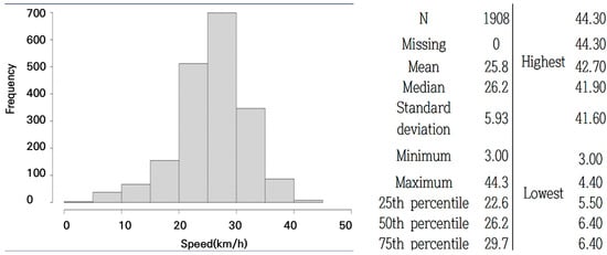 Distribution of bicycle riders’ travel speeds using the Strava App (www.strava.com, accessed on 20 October 2022.).