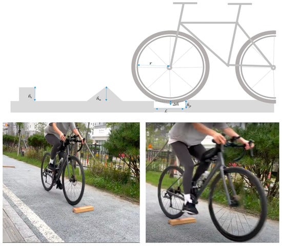 In Equation (2), when the diameter of a pothole (L) is smaller than the size of the bicycle wheel (2r), the wheel does not reach the bottom of the hole, causing only a small drop and resulting in a smaller acceleration change compared to the step difference. Therefore, in this study, various risk factors occurring on bicycle path pavements were classified into upward and downward step differences, and the changes in 3-axis acceleration based on the size of these step differences were measured.