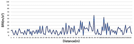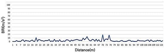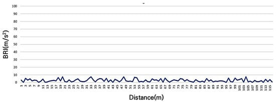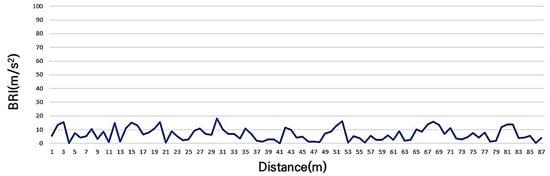 The 11-year concrete-paved shared bicycle and automobile road along the riverside, where spalling and cracks were visually observed and a service level D was expected, exhibited a BRI of 14.5 m/s2, as shown in Figure 9. The maximum recorded value was 60.0 m/s2, the minimum value was 0.24 m/s2, and the standard deviation was 10.9 m/s2, indicating that the BRI measured using the smartphone sensor accurately reflects the actual surface condition.