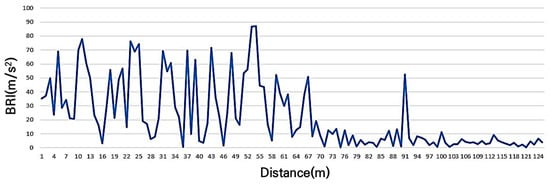 Using a road bike with a tire pressure of 110 psi, the BRI was measured at each point while riding at a speed of 20 km/h across arbitrarily selected expected service levels ranging from A to E. As shown in Figure 6, the estimated BRI for Section A, which represents a newly constructed bicycle road anticipated to have excellent surface roughness, was 3.0 m/s2. The maximum recorded value was 18.7 m/s2, the minimum value was 0.0 m/s2, and the standard deviation was 3.1 m/s2, indicating favorable pavement conditions.