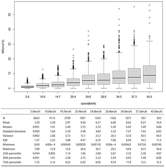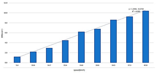 The experiment involved traversing the same section at incrementally increasing speeds, ranging from 5 km/h to 45 km/h in 5 km/h intervals. A distance of 150 m was covered, with the experiment repeated 30 times to ensure reliability. During each trial, the cyclist aimed to maintain the target speed, while actual speed was calculated using GPS data from the smartphone. Human factors introduced discrepancies between the intended and actual cycling speeds. When measuring personal mobility speed, such as bicycles, errors can occur due to human factors. In particular, errors in the measured speed may occur due to differences in the speed control method depending on the driving environment, the user’s experience level, and safety consciousness [21]. Consequently, the analysis of BRI values was based on the actual measured speed rather than the target speed. Detailed findings and further statistical analysis are presented in Figure 11.