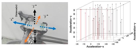 Changes in three-axis acceleration due to bicycle riding(Red line Acceleration-x and black line Acceleration-y refers to the acceleration points and locations with smartphone sensors measurement).
