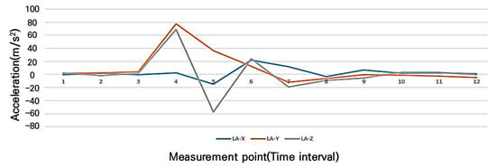 The purpose of this study is to detect risk factors by measuring the impact index that occurs during a bicycle collision, with a specific focus on step differences, which are the most sensitive factor in terms of acceleration changes. In fact, the change in the three-axis acceleration was found to be diverse during the bicycle’s driving process. The acceleration measurements used to determine the risk points indicated that the bicycle handle steering, influenced by the step, was significantly affected, as shown in Figure 13. Therefore, it is crucial to minimize errors caused by human factors through a detailed analysis of these sections in order to accurately determine the risk points.