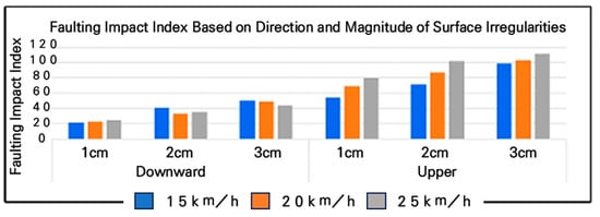 The results revealed significant differences in the FII experienced by cyclists, depending on the direction of the step. In experiments conducted at various speeds (15–25 km/h) with five repetitions per step, upward steps produced an FII approximately 2.5 times greater than that of downward steps. Despite the constant step height, the direction of the cyclist’s approach determined whether the step was categorized as upward or downward. Therefore, future experiments focused on measuring FII will prioritize upward steps, which induce greater impact, and exclude the less impactful downward steps. The results of FII based on the direction and magnitude of irregularities on bicycle roads are described in Figure 15. Furthermore, experiments with a step height of 4 cm revealed hazardous situations, such as tire punctures, due to the severity of the impact. As a result, steps exceeding 4 cm in height were classified as highly hazardous. Consequently, this study suggests that the ideal FII range should be between 1 and 3 cm for safe bicycle road conditions.