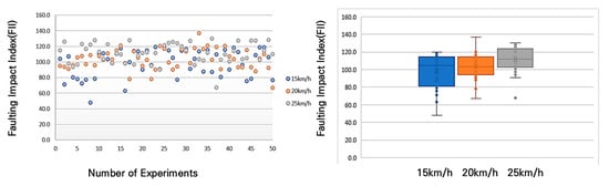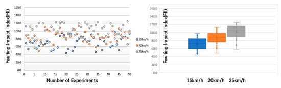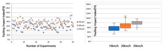 As a result of the experiments, the impact index generally increased proportionally with both the step size and bicycle speed. The average FII based on the driving speed and the size of the step difference is shown in Table 8. However, it is presumed that in certain sections, riders unconsciously prepared for shocks by adjusting their arms and legs for absorption, although this study did not account for such human factors. To minimize these influences, changes in impact acceleration were measured on bicycle paths, and user satisfaction with surface conditions was evaluated through a graded survey [22]. It is suggested that panel analysis involving actual cyclists be conducted to further reduce human variability and support interpretation in sections where direct measurement is challenging. Nonetheless, the observed trend—that the impact index increases with both step size and speed—aligns with previous findings showing that the impact acceleration transmitted to bicycles increases with bicycle speed and the magnitude of step differences [8,23].