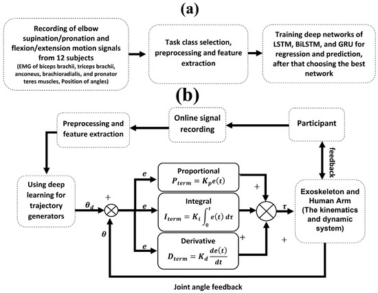 The process of performing the proposed controllers: (a) Training CNN, LSTM, LSTM, BiLSTM, GRU, and GRU deep neural networks for torque prediction based on sensor data; (b) Use best deep neural networks to predict torque-based on sensor data.