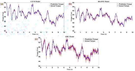 Comparison of predicted and actual torque signals over time for (a) LSTM, (b) BLSTM, and (c) GRU deep learning models. The results demonstrate the effectiveness of the trained networks in accurately capturing the temporal dynamics of the exoskeleton joint torque signals.